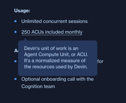 Devin's Agent Compute Unit (ACU) is a normalized measure that bundles together all computational resources (think virtual machine time, model inference, and networking bandwidth) into a single unit representing approximately 15 minutes of active AI development work.