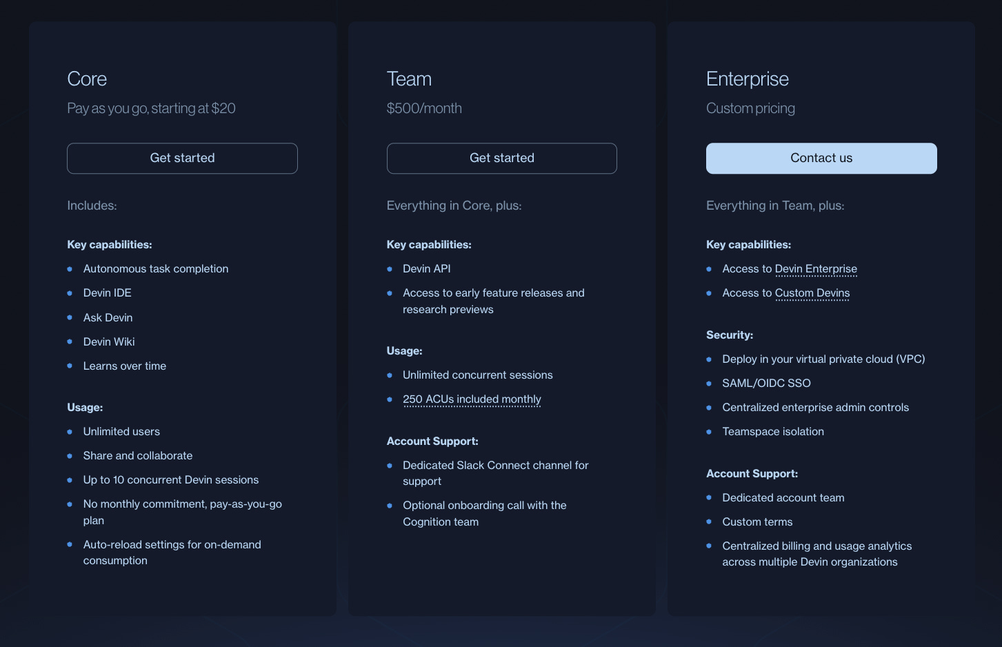 As each ACU represents approximately 15 minutes of "active Devin work," the $20 entry plan is equivalent to about 2.25 hours of work.