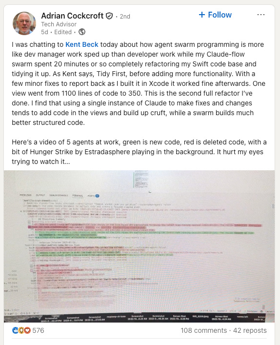 The next wave of disruption won't be from individuals building faster; it'll be from code writing itself in swarms. Agentic development tools are showing us what happens when you give five agents the ability to coordinate, refactor, and reason about an entire codebase simultaneously.