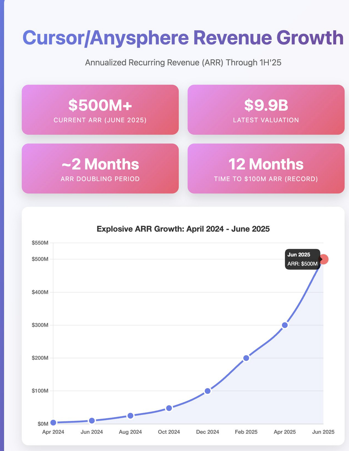 In the meantime, Cursor continued to experience breakneck growth and saw its annual recurring revenue breach the $500 million mark by June 2025, after revenue doubling roughly every two months.