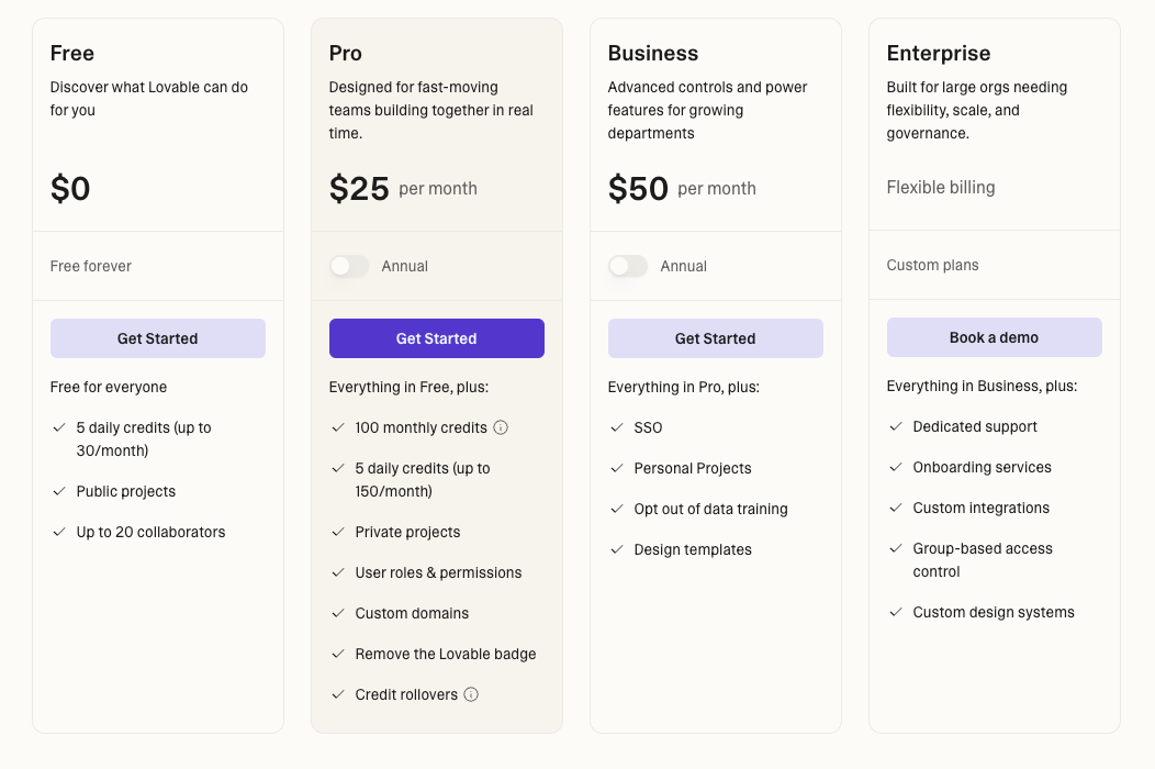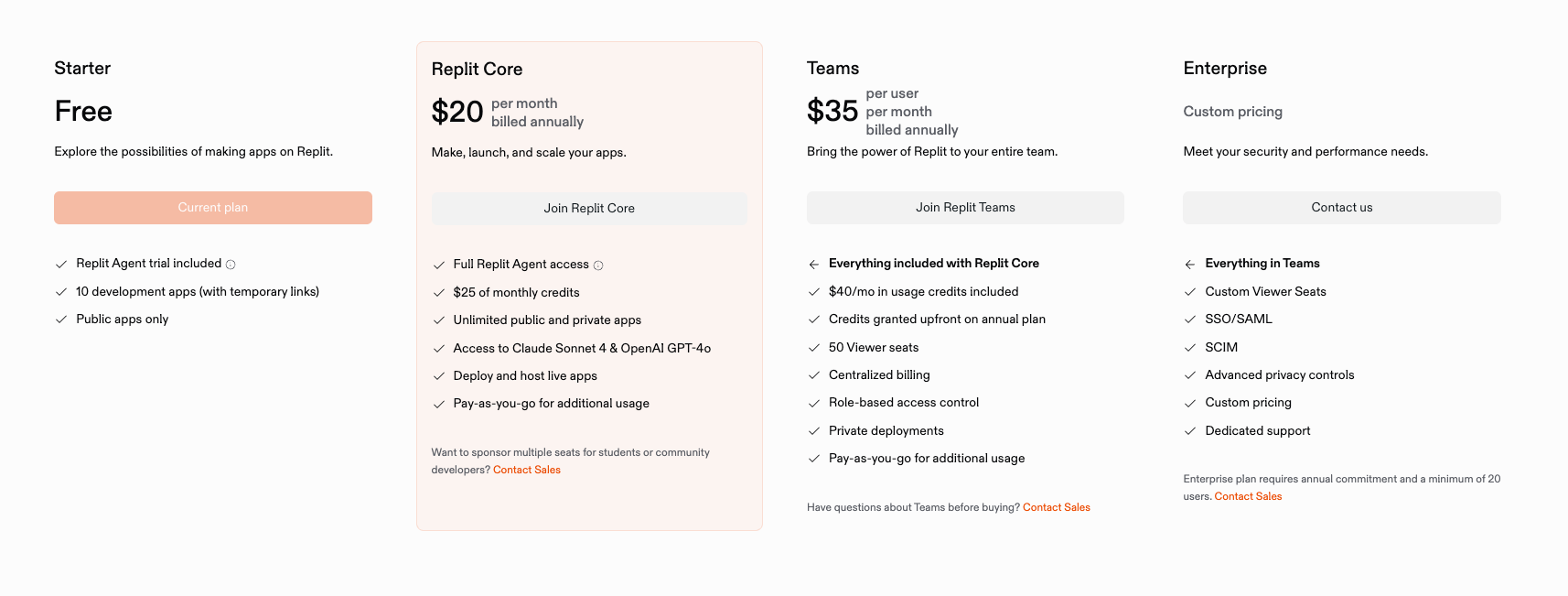 Replit’s pricing page has an interesting strategy, comparing the money you spend to money you recieve ($20/month for $25 worth of credits). Though, “credits” seems opaque since there isn’t an immediate way to calculate the value or output you’ll get from $25 worth of Replit credits. But diving deeper into their effort-based pricing blog, it’s actually quite interesting. Read it here.