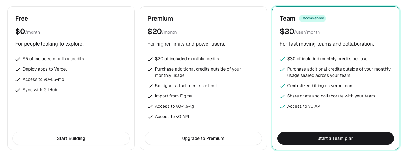 v0 operates on a credit system where users receive monthly credit allowances: Free ($5), Premium ($20), Team ($30/user), and Enterprise (custom). Credits are consumed based on actual token usage across different model tiers, with v0-1.5-lg costing $7.50 per million input tokens and $37.50 per million output tokens, while smaller models like v0-1.5-sm cost significantly less at $0.50/$2.50 per million tokens.