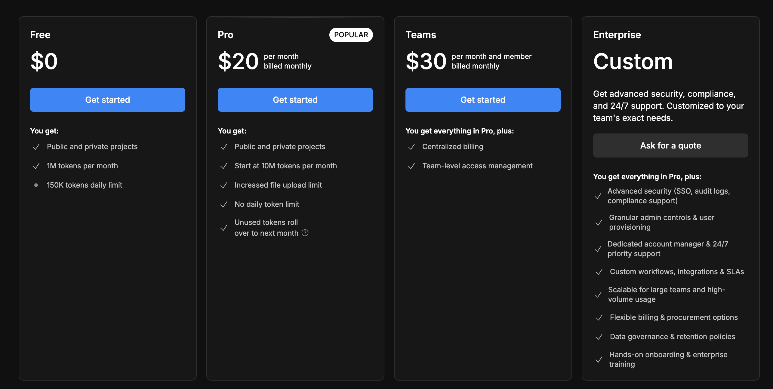 The free plan comes with 1 million tokens per month and a 150K daily limit. Which is enough for basic usage, but you hit the daily cap almost immediately when trying to build anything with complexity. The Pro plan bumps you up to 10 million tokens per month, removes the daily cap, and allows unused tokens to roll over. The Teams tier adds admin features like centralized billing and access controls, but keeps the same usage base.