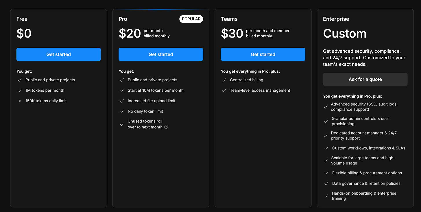 Bolt presents itself as the simple option: $0 to start, $20/month for Pro, and $30/month per user for Teams. But behind the clean UI is a usage model that centered around tokens.