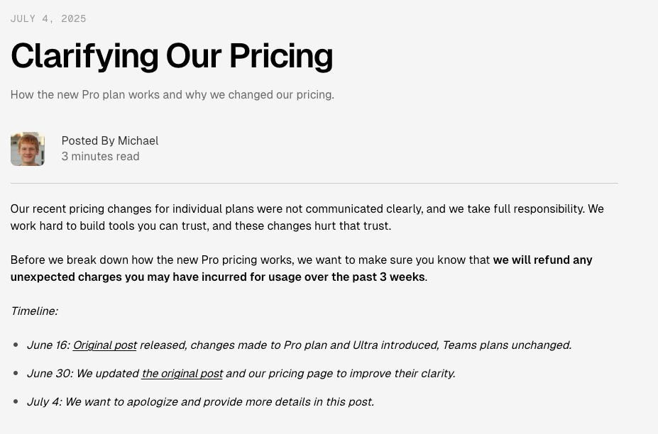 The company was forced to respond. Overnight, it dropped request-based pricing entirely and moved to a hybrid usage-based billing system grounded in token consumption. The new Ultra plan, for heavy users was priced at $200/month and offered ~20x more usage, but the Pro plan introduced hard limits based on compute consumption, not requests.