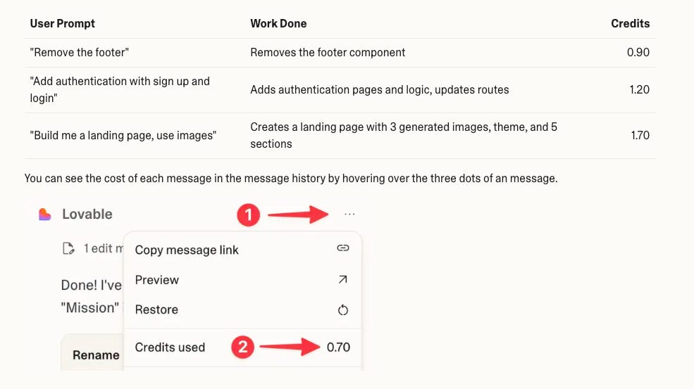 Tokenomics Takeaway: Lovable's approach addresses one of the core problems in AI tool pricing: the massive variance in computational work between simple and complex requests. What sets them apart is the radical transparency: users can see the exact cost of each individual message by hovering over message options in their history. By moving to task-complexity pricing in Agent Mode with full cost visibility, they've created a model where users pay more fairly for what they actually get while understanding exactly what each interaction costs.