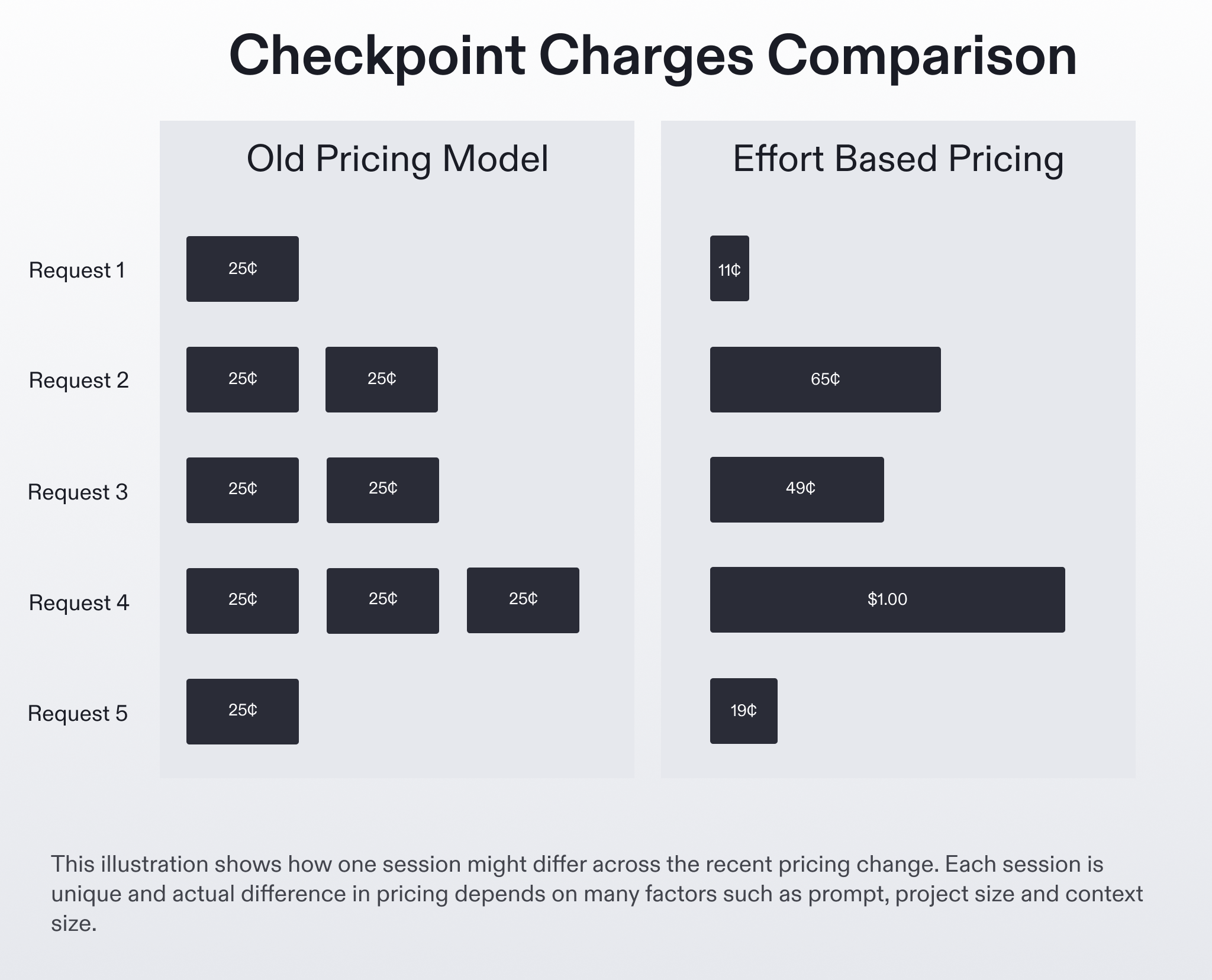 Replit rolled out an effort-based pricing model in mid-2025 that charges users based on the actual complexity of each task, rather than by token or message count. The system uses “checkpoints” to measure work, so instead of every request costing the same, simpler edits (like renaming a variable) might cost a few cents, while more involved tasks (like building a new component) cost more.